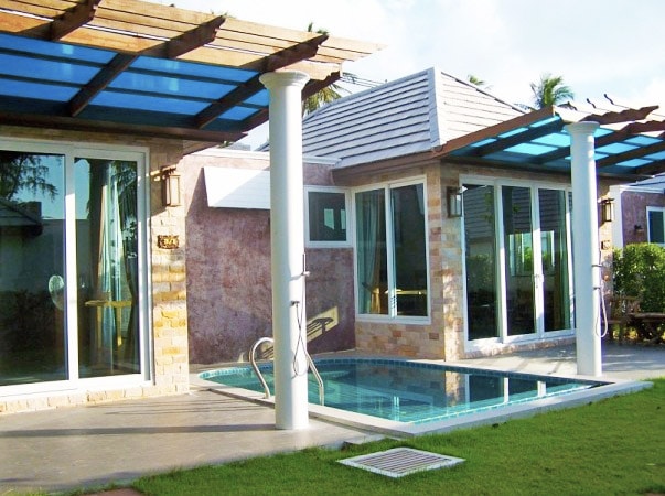 - Две виллы бунгального типа с King size кроватью и софой, соединённые переходом с дверью. Зона спальни от гостиной в каждой вилле визуально отделена ступеньками.