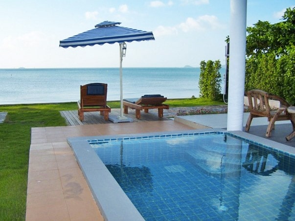 - Вилла бунгального типа с King size кроватью и софой. Зона спальни от гостиной визуально отделена ступеньками.