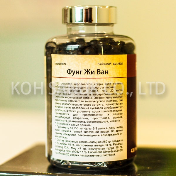 Состоит из более чем 20 ценных видов китайских лекарственных растений и переработаннного яда тайской королевской кобры, это лекарство эффективно выводит избыточное количество мочеуксусной кислоты, тем самым способстуя лечению артрита, полиартрита и артроза. Лечит воспаление суставов и избавляет от усталости, а также укрепляет кости при остеопорозе. Профилактика и лечение межрёберной невралгии, прострелов, ишиаса, радикулита, ревматизма, остеохондроза, миозита.